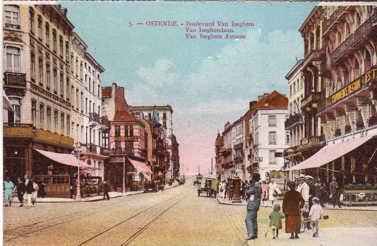 N°3. - Ostende - Boulevard Van Iseghem. Van Iseghemlaan. Van Iseghem Avenue. - Bijgekleurde kaart. - Links, op de hoek met de Vlaanderenstraat, "Hotel Alberta", wat verder op de hoek met de Louisastraat, de brasserie dancing "La Terrasse" en rechts, "Hotel Providence Regina".