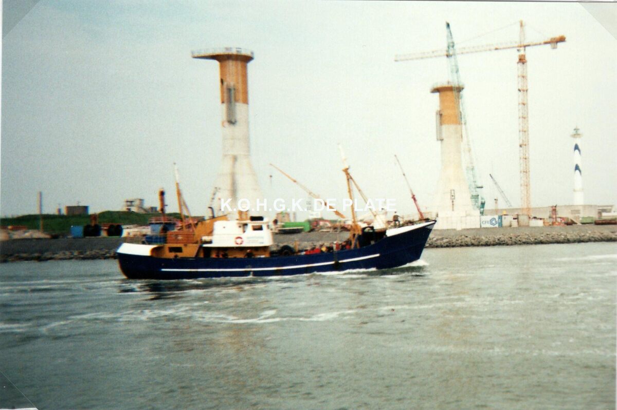Formaat : 10 x 15 cm. - Op de achtergrond, de windmolens in aanbouw op de Oosteroever en vuurtoren "Lange Nelle"