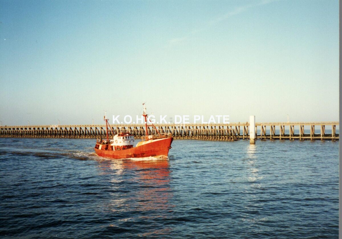 Formaat : 9 x 12,5 cm. - Sportvissersvaartuig Marcella II in de havengeul met in de achtergrond het Ooststaketsel