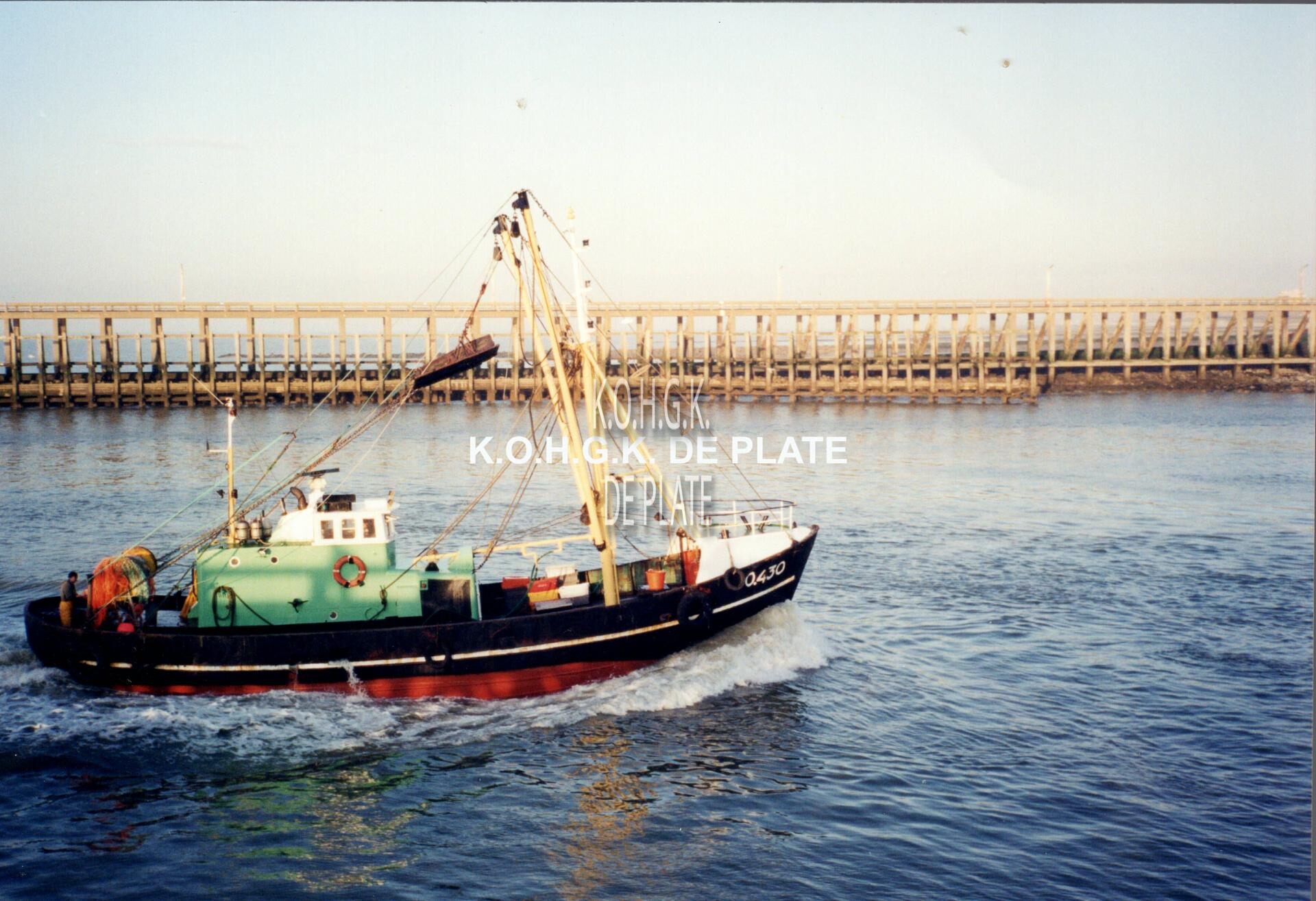 Formaat : 10 x 15 cm. - Vissersvaartuig O.430 "Bimin" in de havengeul. Op de achtergrond, het Ooststaketsel.