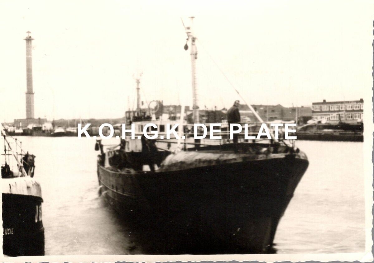 Formaat : 8,5 x 12 cm. - Het Vissserijdok. Een vissersvaartuig gaat aanmeren langs de kaai van de Vismijn. Op de achtergrond, de vuurtoren "Lange Nelle".