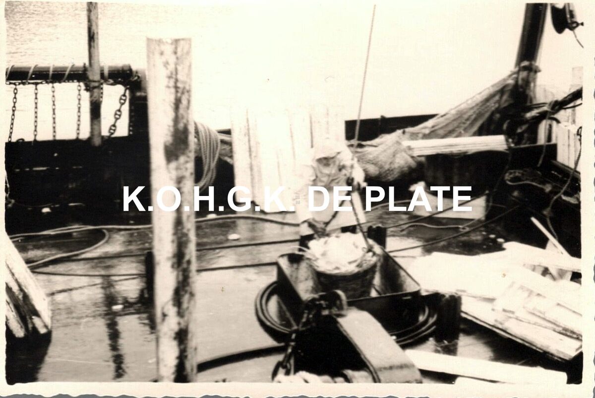 Formaat : 8,5 x 12 cm. - De vangst wordt gelost. De vis wordt in grote losbennen één voor één uit het visruim gehesen en met een zwaaibeweging op de sorteertafel gezwierd.
