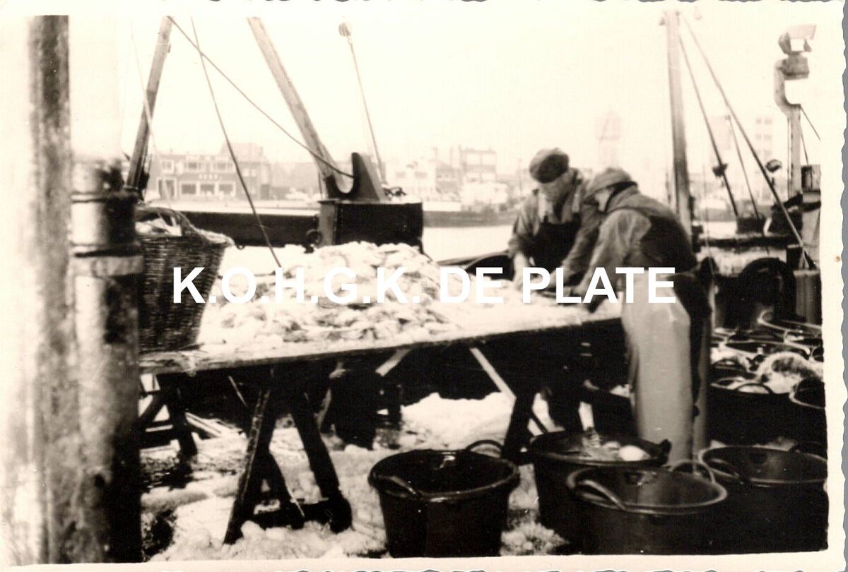 Formaat : 8,5 x 12 cm. - Het sorteren van de vis. De vislossers halen de vissen van tussen het ijs en sorteren ze per soort en grootte in de vismijnbennen.
