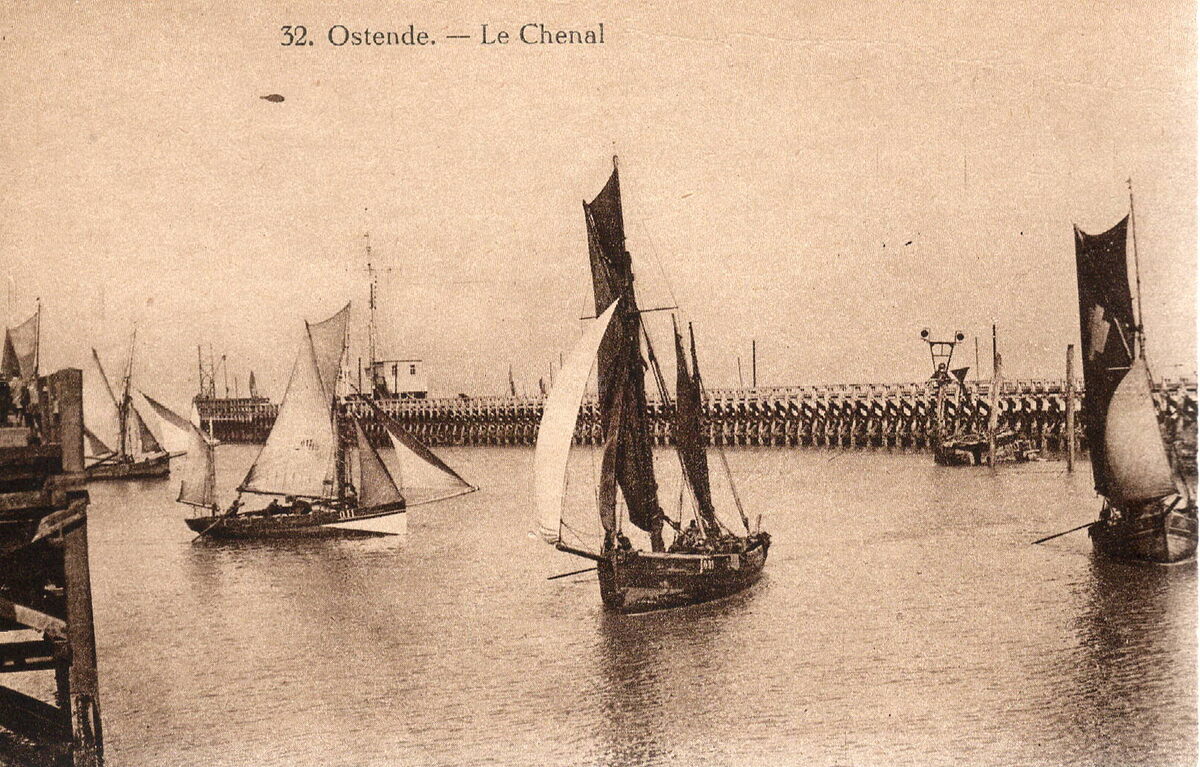 TOB. L'Illustration Générale, Bruxelles-Paris. - 32. Ostende - Le Chenal. - Zeilvissersvaartuigen in de havengeul. We zien ook het Ooststaketsel en tijseinpost.