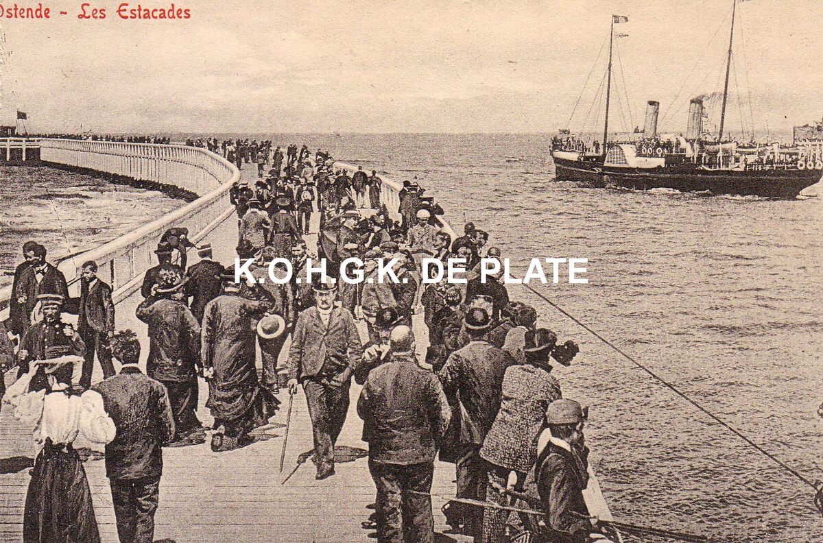 Edit. V.G. [=Victor Grégoire], 42, Avenue du Midi, Bruxelles. - Ostende - Les estacades. - Oostende in de Belle Epoque. Veel volk op het Weststaketsel. Een raderstoomboot van de Oostende Doverlijn verlaat de haven van Oostende.