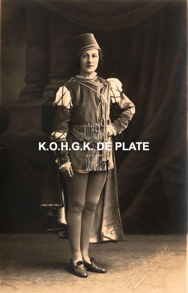 Formaat : 16,5 x 10,5 cm. - Olga Calmeyn in de rol als page in de opera "Roméo et Juliette" van Charles Gounod opgevoerd in de "Koninklijke Frans Schouwburg" te Antwerpen.