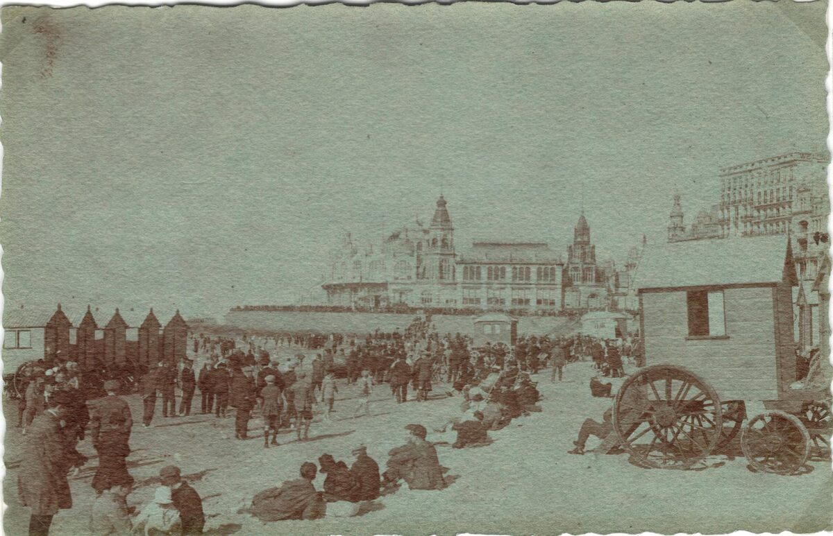 Strandrecreatie op het Groot Strand. De dagtoeristen komen genieten van de zeelucht en.... Op de achtergrond, de westgevel van het derde Kursaal langs de Zeedijk
