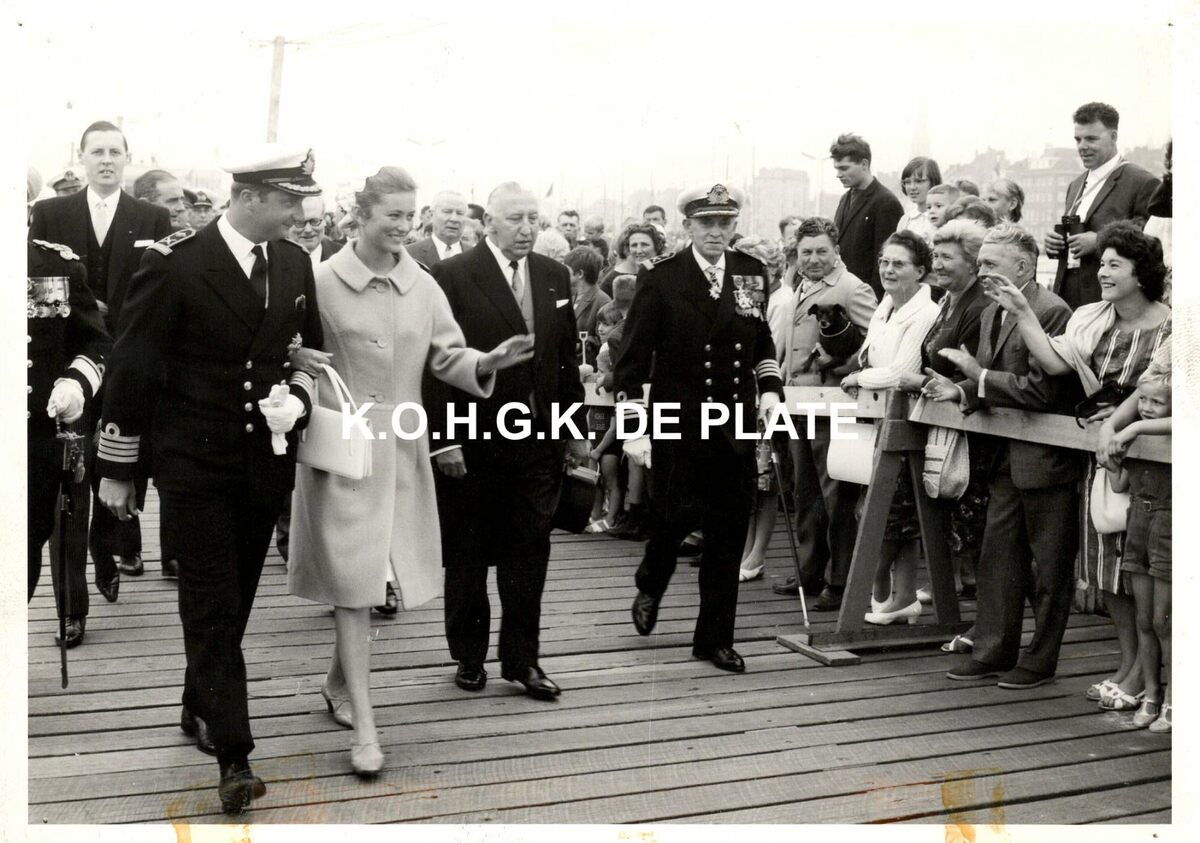 Formaat : 13 x 18 cm. - Prins Albert en Prinses Paola op weg naar 't koptje van 't hoofd (het einde van het Weststaketsel) voor het schouwen van de vloot. Zij zijn vergezeld van Kapitein-ter-zee Jules Delforge (rechts), de minister van landsverdediging P.W. Segers, burgemeester Jan Piers. Ook de stafchef van de Zeemacht Léon Lurquin is aanwezig. Hier op het Weststaketsel begroet door een blijde bevolking