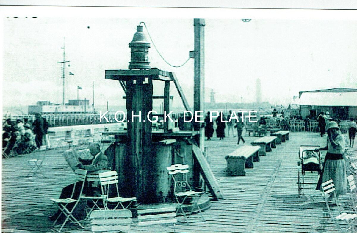Afdruk. - Formaat : 14.5 x 9.5 cm. - Zicht vanaf de kop van het Weststaketsel. We zien de tijseinpost op het Ooststaketsel. De noodvuurtoren op de oosteroever en de derde vuurtoren in aanbouw. Periode midden de jaren twintig in het interbellum