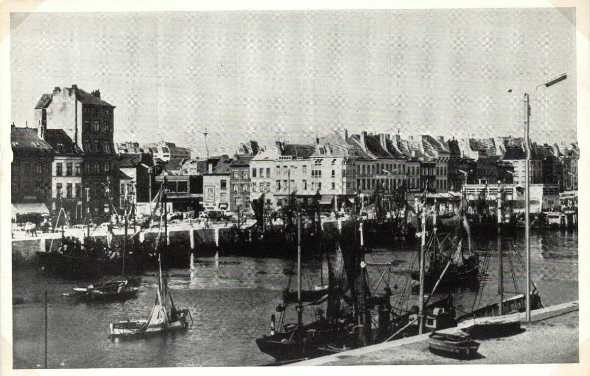 Formaat : 9 x 14 cm. - Mess, N°48523-425. - Oostende - Vissershaven. - Vissersvaartuigen gemeerd in het Montgomerydok. Op de achtergrond, de Visserskaai en in het midden het Vissersplein. Rechts, de Garnaalmijn.