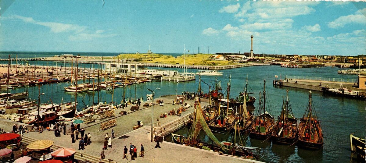 Kruger, N° 933/55. - Panoramische kaart. Vooraan, detail van de ambulante viskramen langs de Visserskaai. Vissersvaartuigen gemeerd in het Montgomerydok nabij de vistrap. Links, zien we dat tijdens de zomermaanden er veel jachten en pleziervaartuigen gemeerd liggen nabij de "Royal North Sea Yacht Club". Detail van het Klein Strand. De havengeul met toegang tot de vissershaven, en op de achtergrond, de oosteroever, het domein de "Halve Maan" en de vierde vuurtoren "Lange Nelle".