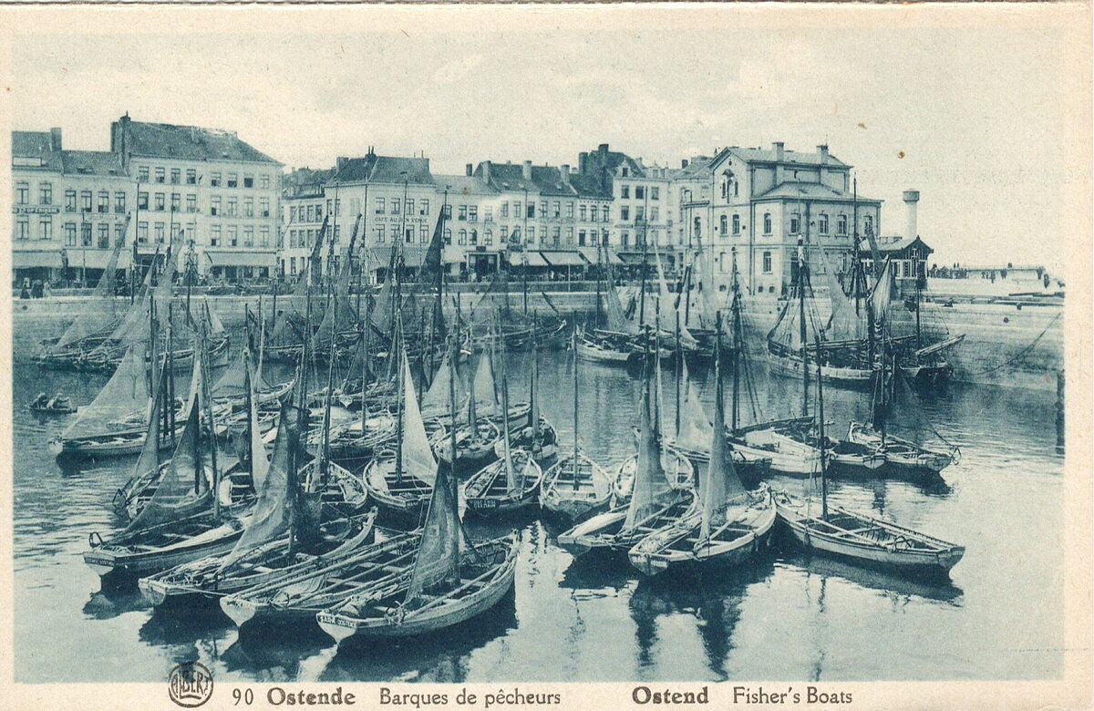 Albert, N° 90. Phototypie, A. Dohmen, Bruxelles. - Ostende - Barques de pêcheurs. Ostend - Fisher's Boats. - Vissersvaartuigen gemeerd in het Schuildok. Vooraan, enkele Oostendse schovers. Rechts, het gebouw van de Bestendige Reddingsdienst. Op de achtergrond, de Visserkaai.