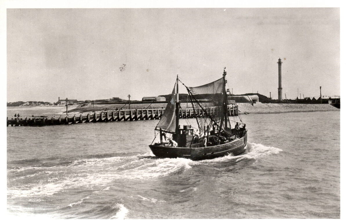 Best, Anvers. - Ostende - Chaloupe de crevettes. Oostende - Garnaalsloep. - Op de achtergrond, de oosteroever met een gedeelte van het Ooststaketsel, de "Halve Maan" en de vierde vuurtoren "Lange Nelle".