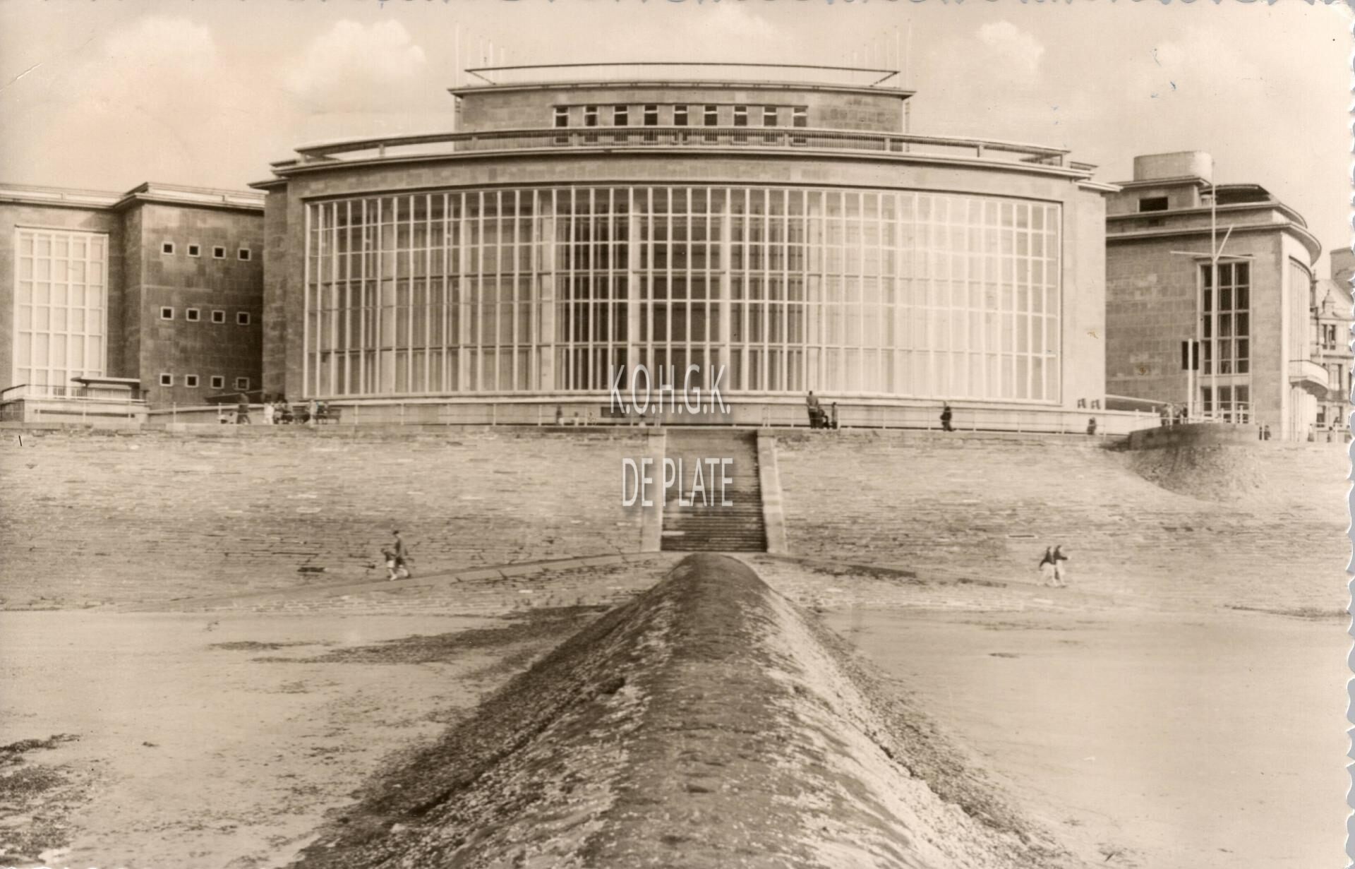 De noordgevel van het vierde Kursaal langs de Albert I-promenade gezien vanop een golfbreker op het Groot Strand.