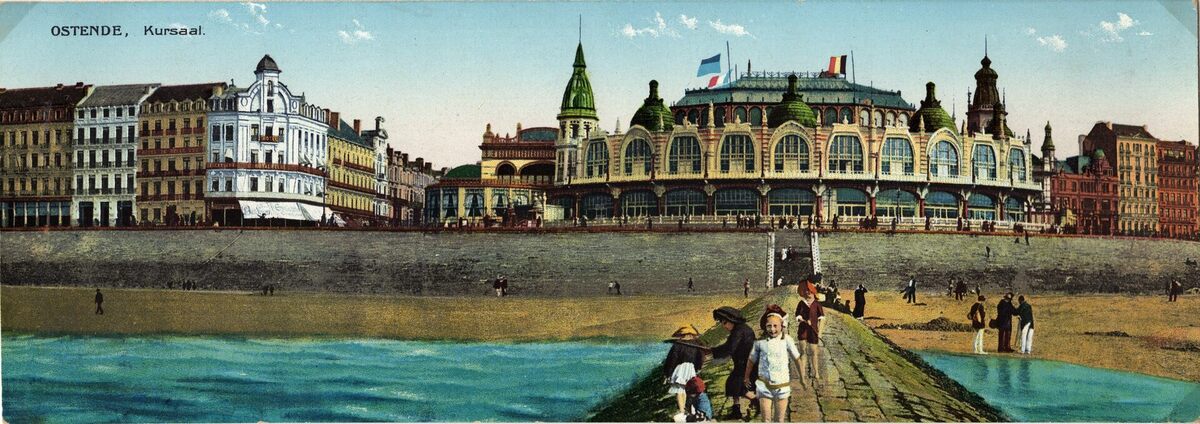 Le Bon 20. - Gekleurde kaart. - De noordgevel van de derde Kursaal langs de Zeedijk, gezien vanop een golfbreker op het groot strand