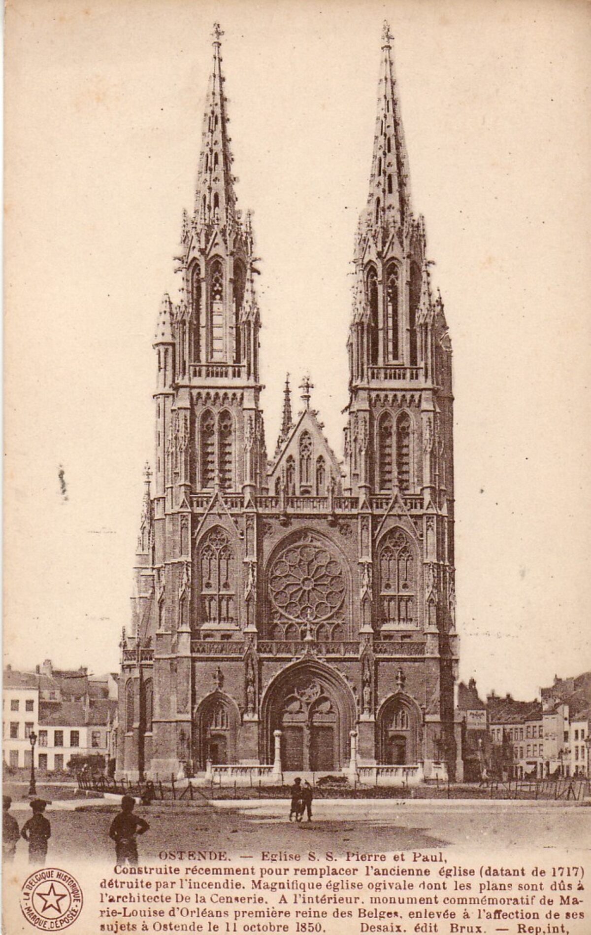 Construite récemment pour remplacer l'ancienne église (datant de 1717) détruite par l'incendie;magnifique église ogivale dont les planssontdus à l'architecte De la Conserie. A l'intérieur monument commémoratif de Marie-Louise (sic) d'Orleans première reine des Belges enlevée à l'affection de ses sujets à Ostende le 11 octobre 1850
