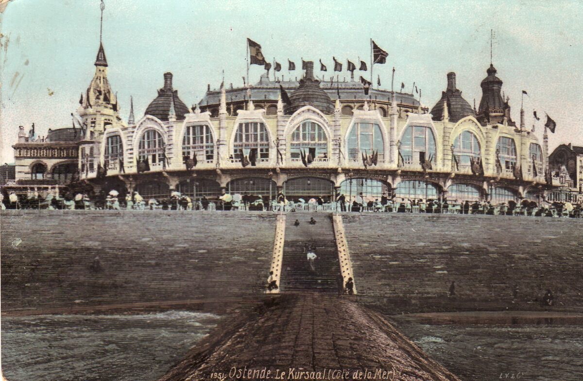 Leopold Verger & C°, N° 1951. - Le Kursaal (Côté de la Mer). - Gekleurde kaart. - De noordgevel van het derde Kursaal langs de Zeedijk. Vooraan, het Groot Strand en golfbreker.