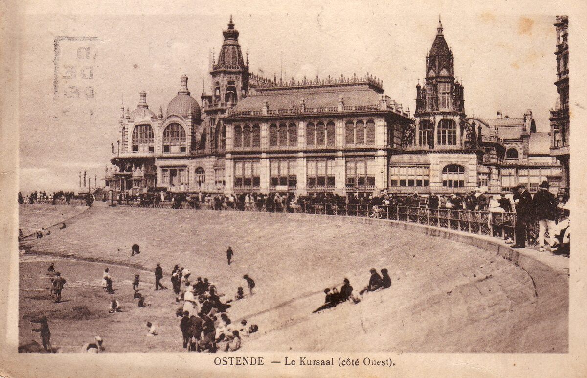 Le Bon. - Ostende - Le Kursaal (côté Ouest). - De westelijke gevel van het derde Kursaal langs de Zeedijk. De dijkglooiing naar het Groot Strand.