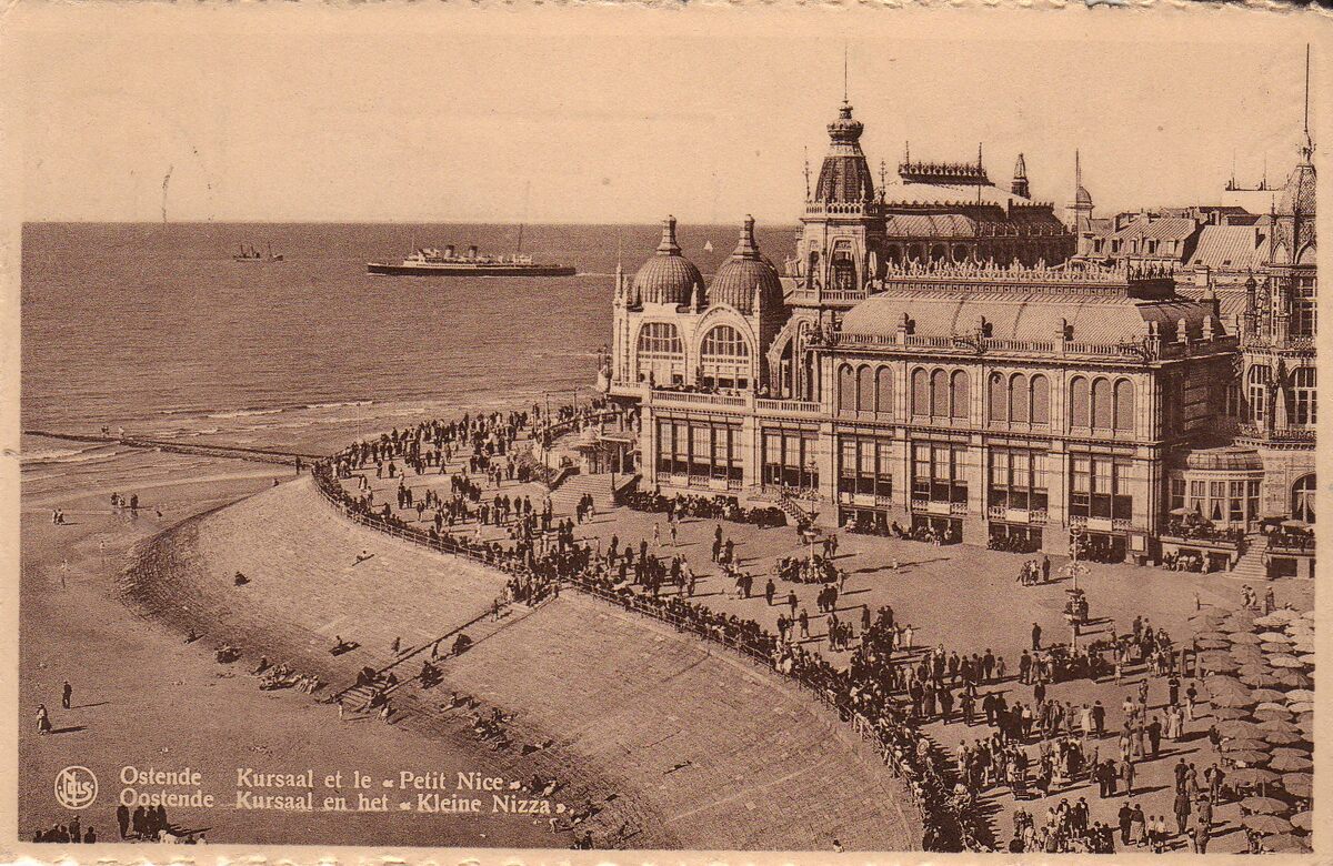 Nels, n° 3. - Ostende - Kursaal et le "Petit Nice". - Oostende - Kursaal en het "Kleine Nizza". - De westgevel van het derde Kursaal langs de Albert I-promenade. Het plekje wordt ook "Petit Nice" genoemd omdat het beschutting biedt bij een kille noorderwind. Een pakketboot van de Oostende - Doverlijn op weg naar Engeland.
