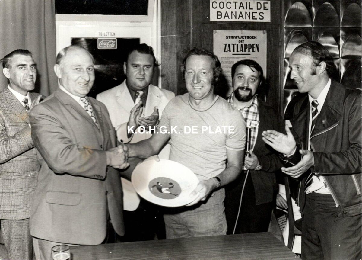 Formaat : 12,5 x 17,5 cm. - Foto van de viering in het clublokaal van Hoger Op met in het midden kapitein Poppieters; links van hem schepen Achtergaele. De club werd opgericht in 1948 en opgeheven in 2011.