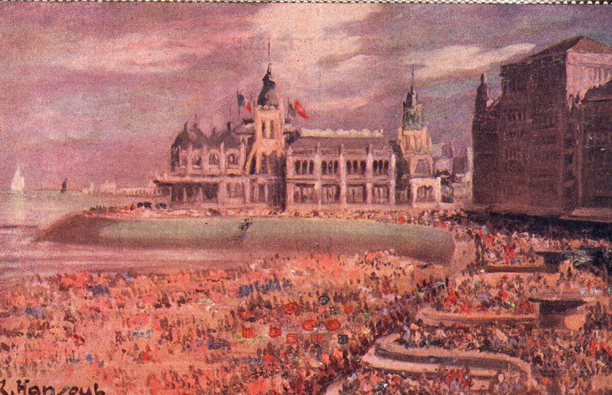 Passez vos vacances à Ostende. R. Hansoul. - Kaart naar een schilderij van René Hansoul. We zien het Groot Strand in het interbellum. Vooraan, de badinstallaties onder de Albert I-Promenade en de westelijke gevel van het derde Kursaal