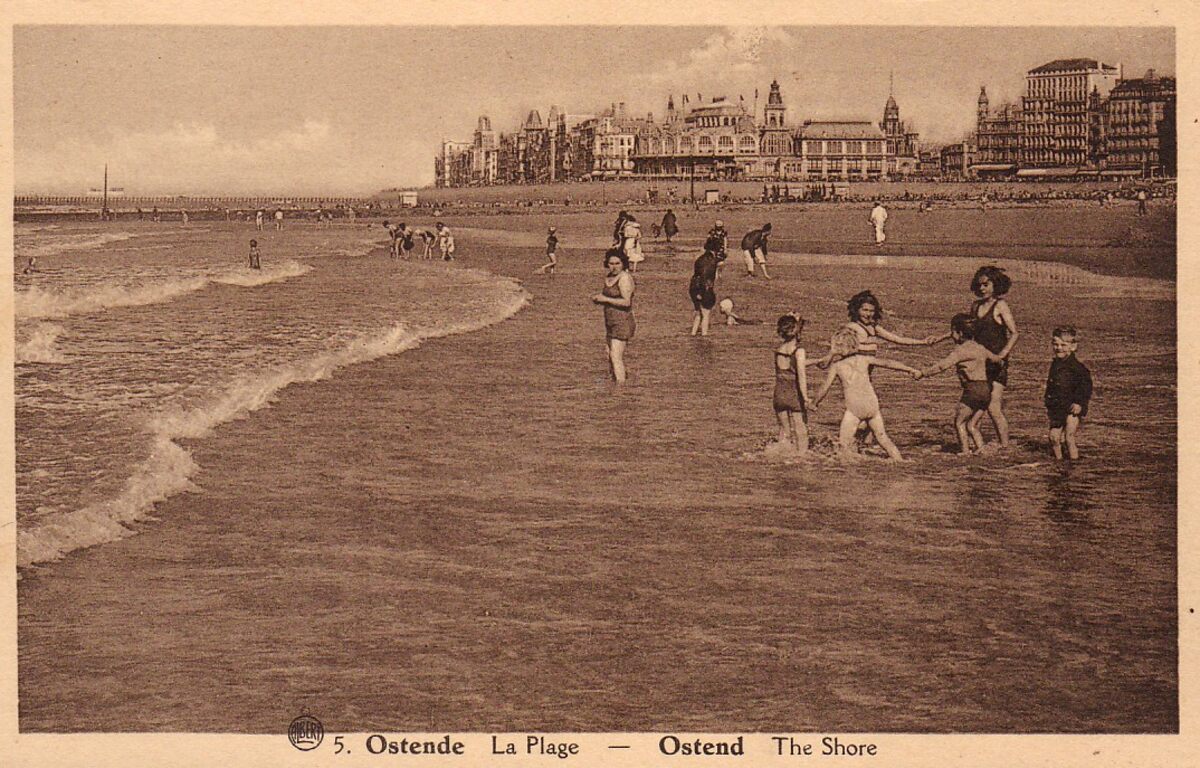Albert. N° 5. - Ostende - La Plage. Ostend - The Shore. - Pootjebaden langs het groot strand in het Interbellum. Op de achtergrond het derde Kursaal