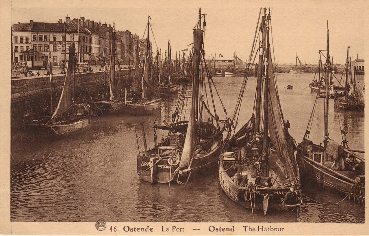 Albert, N° 46. - Ostende - Le Port. Ostend - The Harbour. - Vissersvaartuigen gemeerd in het Montgomerydok. Links, de Visserskaai en een stadstram. Vooraan in het dok, de O.144 "Eugène-Gustaaf" gebouwd in 1926 voor reder Alfred Smissaert, Schippersstraat 5. Annuaire commercial, industriel et maritime d'Ostende et du Littoral. 1932. p.35