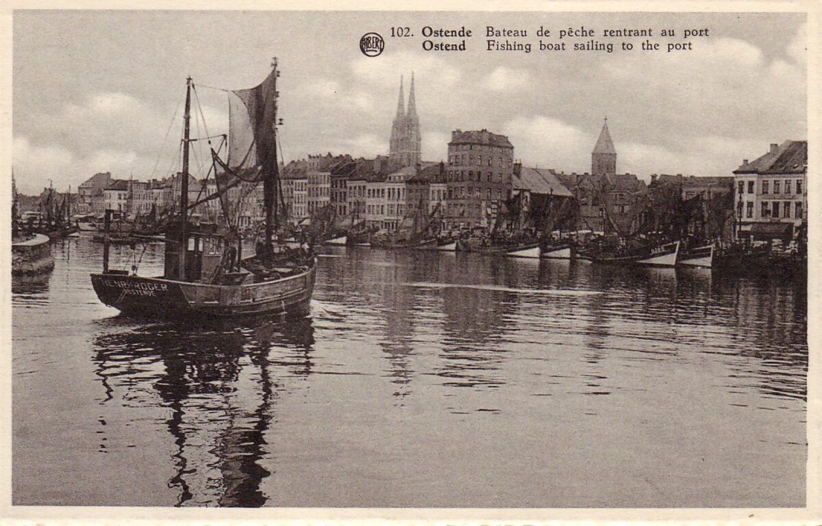 Albert, N° 102. - Ostende - Bateau de pêche rentrant au port. Ostend - Fishing boat sailing to the port. - Vissersvaartuigen gemeerd in het Montgomerydok langs de Visserskaai. Het kustvissersvaartuig de O.759 "Henri-Roger" vaart het dok binnen. Op de achtergrond zien we de twee torens van de Sint Petrus en Pauluskerk en rechts de toren, genaamd, de "Peperbusse", van de door brand vernielde Sint Pieterskerk