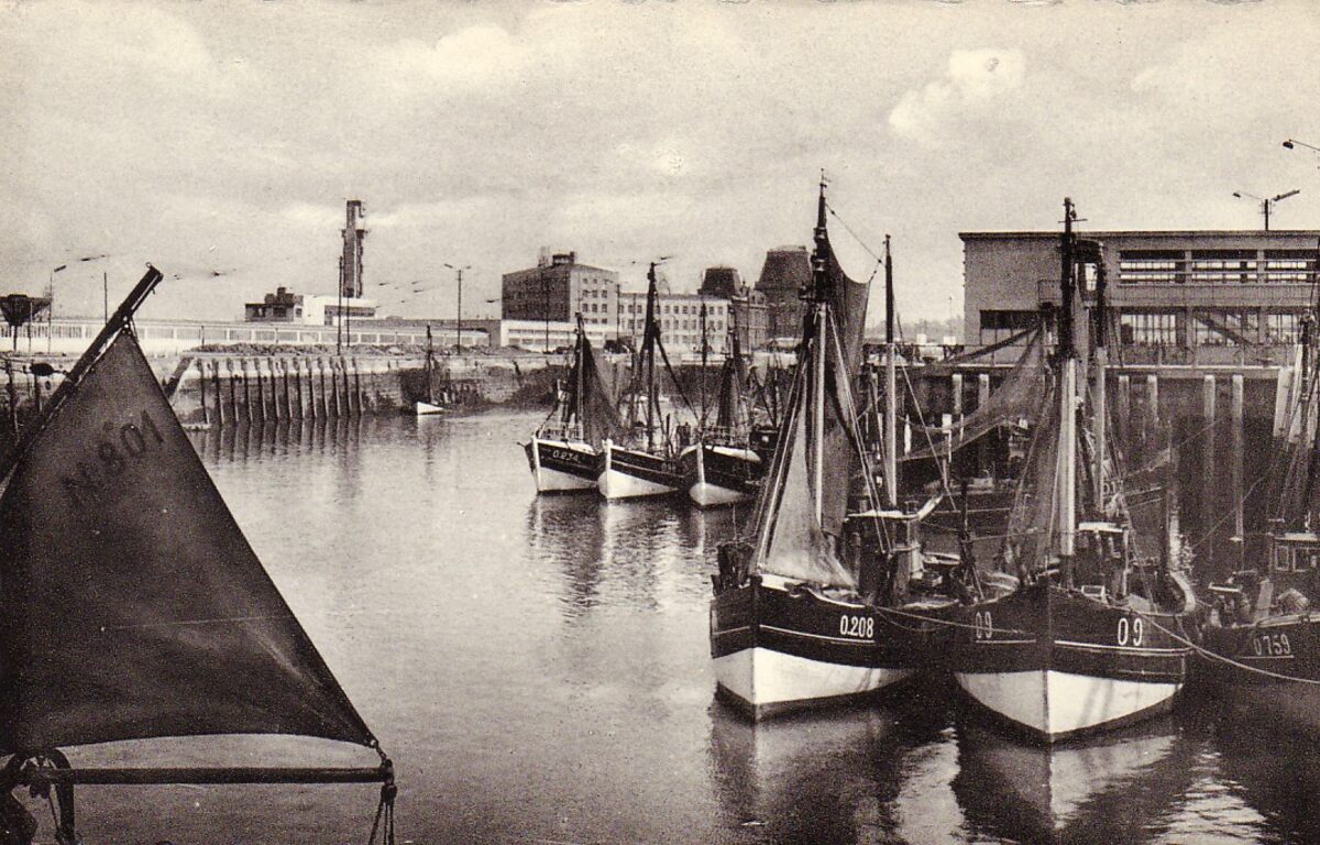 Gare maritime et bateaux de pêche. - Vissersvaartuigen gemeerd in het Montgomerydok. Rechts, de Garnaalmijn langs de Visserskaai. Op de achtergrond, het Zeestation en de gebouwen van het Bestuur van het Zeewezen