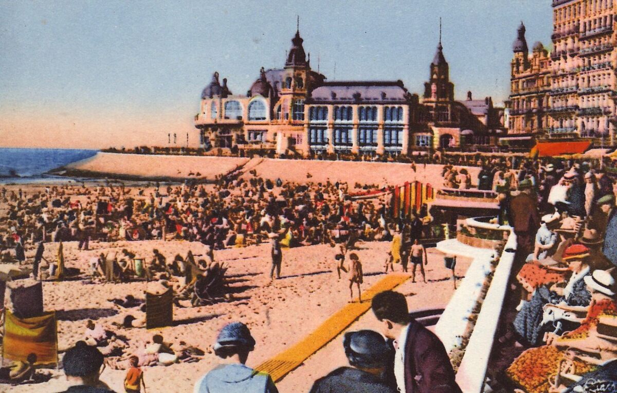 Combier imp. Macon (CIM). - Gekleurde kaart. - Strandrecreatie op het Groot Strand nabij de westelijke gevel van het derde Kursaal gelegen langs de Albert I-promenade. Recht, detail van de badinstallaties onder de Albert I-promenade