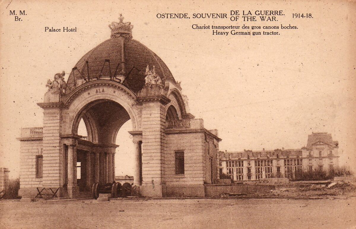 M.M.Br. - Ostende - Souvernir de la guerre 1914-18 Chariot transporteur des gros canons boches. Pstende - Souvenir of the War 1914-18 Heavy German gun tractor. - De inrijpoort van het Royal Palace Hotel. De Duitsers hebben na de installatie van batterij Gneisenau, de gaanderij van het hotel (rechts) afgebroken. Na de oorlog werd de gaanderij herbouwd. Foto genomen na de oorlog