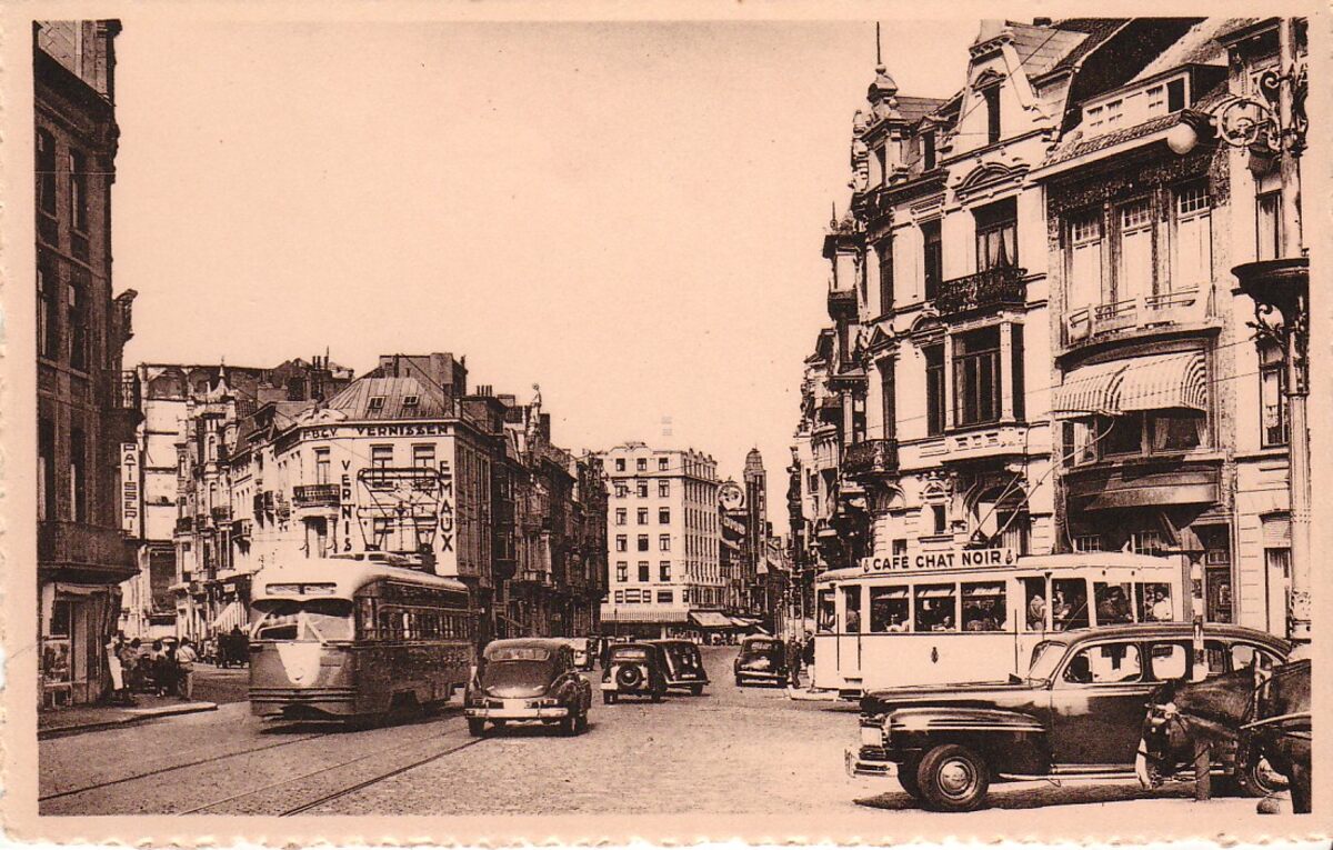 Nels, n° 31. - Ostende - Rue Royale. - Het kruispunt Koningsstraat en Van Iseghemlaan. Rechts, een stadstram in de Van Iseghemlaan. In de Koningsstraat een Amerikaanse "PCC" tram. Reed op de kustlijnen in 1948-1949, maar gaf geen voldoening.