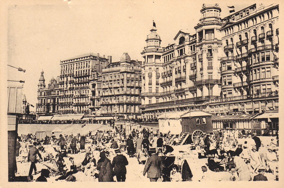 Strandrecreatie op het Groot Strand. Rechts, "Hôtel de l'Océan" en ernaast "Hôtel Continental"