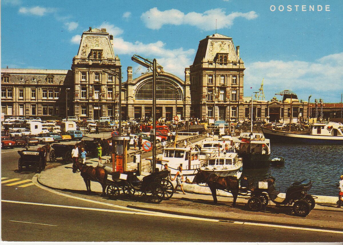 AVM, N° 70. - Koetsiers wachten op de toeristen voor een ritje in de stad. Op de hoek van de Vindictivelaan een telefooncel. Rechts, het eerste handelsdok.
