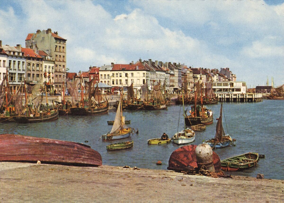 Vissersvaartuigen gemeerd in het Montgomerydok. Wat verder, de Garnaalmijn. Links, de Visserskaai