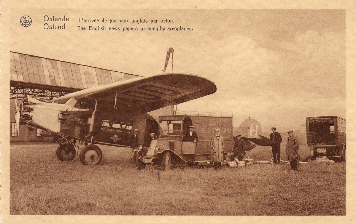 Ostende. L'arrivée de journaux anglais par avion. Ostend. The English news papers arriving by areoplanes. Een Fokker van de KLM. Uiterst rechts F. Devriendt. Vanaf 1923 werden de Engelse kranten per vliegtuig bezorgd. Van Londen met de nachttrein tot Folkestone, waar ze op het vliegveld van Lympne om 6.30 u vetrekken en een uur later te Ostende landen. Eerst bezorgd door SABENA, daarna door de KLM. Prentkaart uit de jaren 1930. Lit. opgave. "Het vliegveld te Stene - Oostende 1920 - 1945" / Walter Major. p.31-32. Plate Bib B560.