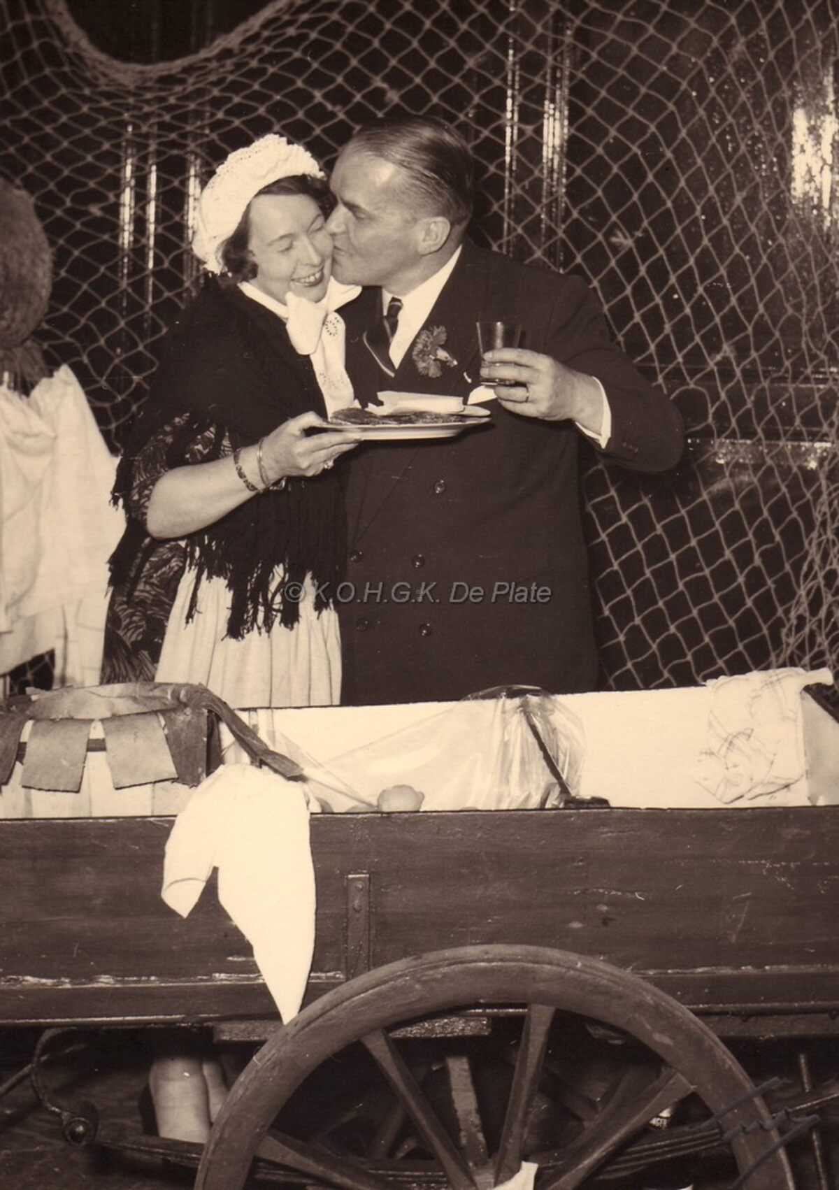 Burgemeester Adolf VAN GLABBEKE geeft een visserinetje een dikke smakkerd.Op de voorgrond een kar zoals toen gebruikt door de visverkoopsters.