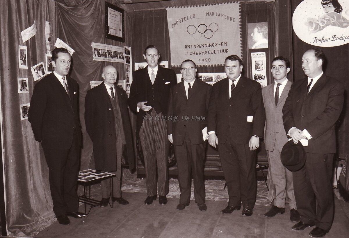Centraal, John Lauwereins. Rechts van hem, Norbert Van der Cruyssen, feestleider Mariakerke,. Links, Jan Piers en Marie-Jozef Porta bij Sportclub Mariakerke.Uiterst rechts staat John Hermans, journalist en gemeenteraadslid.
