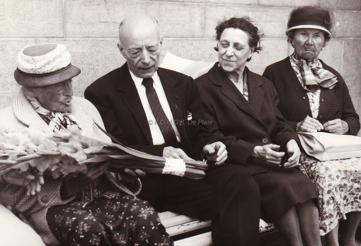 Schepen Marie-Jozef Porta op een bankje met enkele bejaarden en een honderdjarige (links) aan Petit Nice.