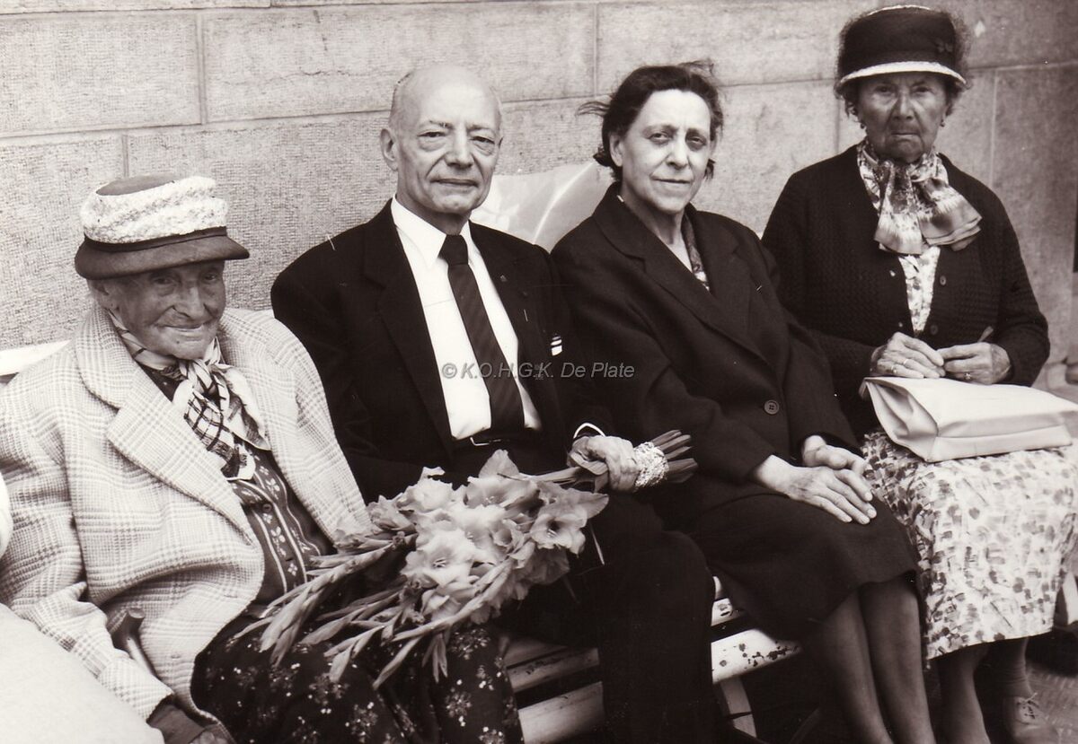 Schepen Marie-Jozef Porta met enkele bejaarden en een honderdjarige (links) op een bankje aan Petit Nice aan de Albert I-promenade. Zie ook foto 2012/0537