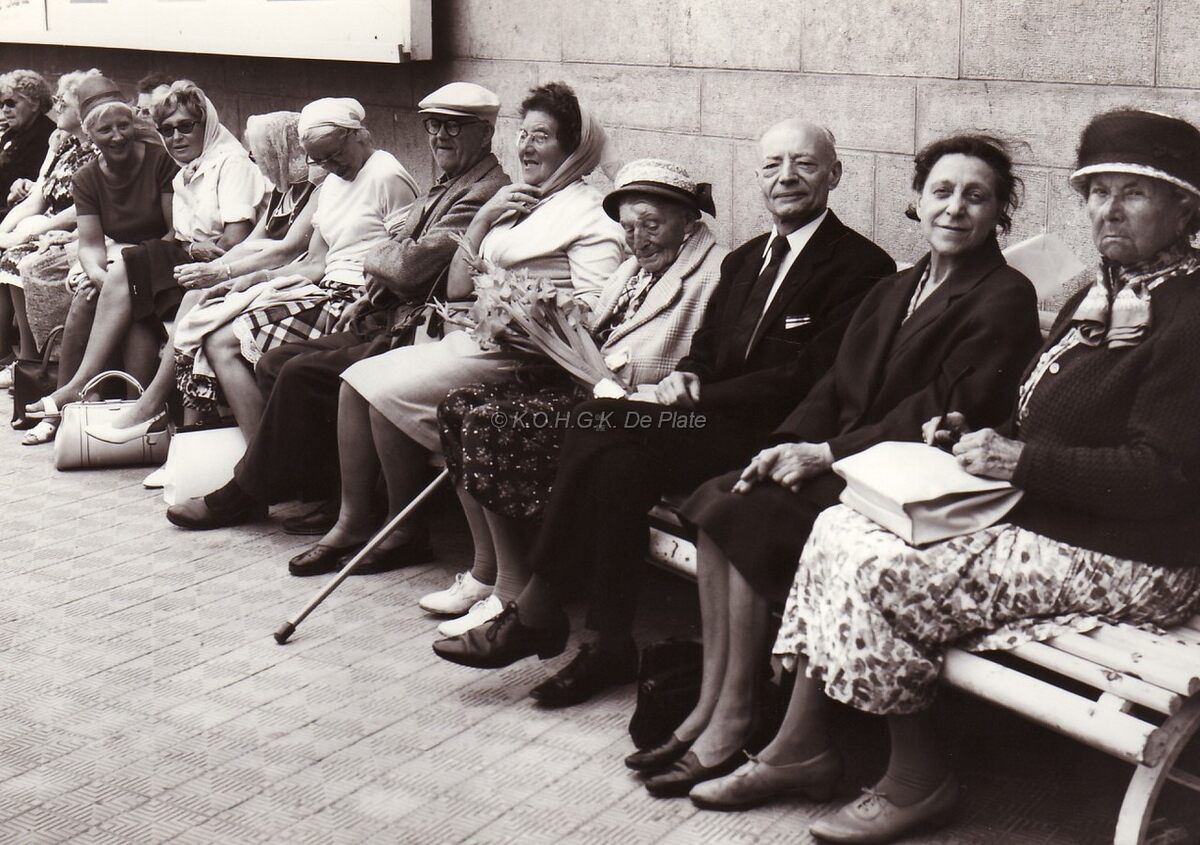 Schepen Marie-Jozef Porta aan Petit Nice tussen een rijtje bejaarden, met links van hem een honderdjarige. Zie ook foto's : 2012/0537 en 2012/0538