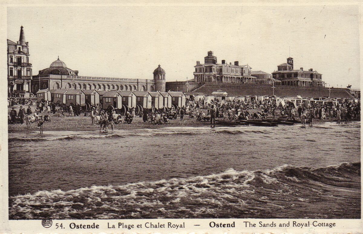 Albert, N° 54. - Ostende - La Plage et Chalet Royal. Ostend - The Sands and Royal Cottage. - Zicht vanaf het groot strand, met de badkarren. Links van het Koninklijk Chalet, de Venetiaanse Gaanderijen , gebouwd naar de plannen van architect Henri Maquet