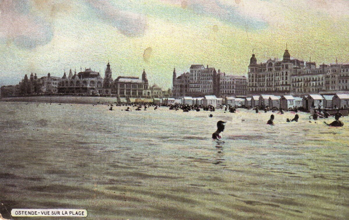 V.0.-D.W. - Ostende - Vue sur la Plage. - Gekleurde kaart. - Zicht vanuit zee. - Rechts, het Groot Strand, de badkarren en de grote hotels langs de Zeedijk.