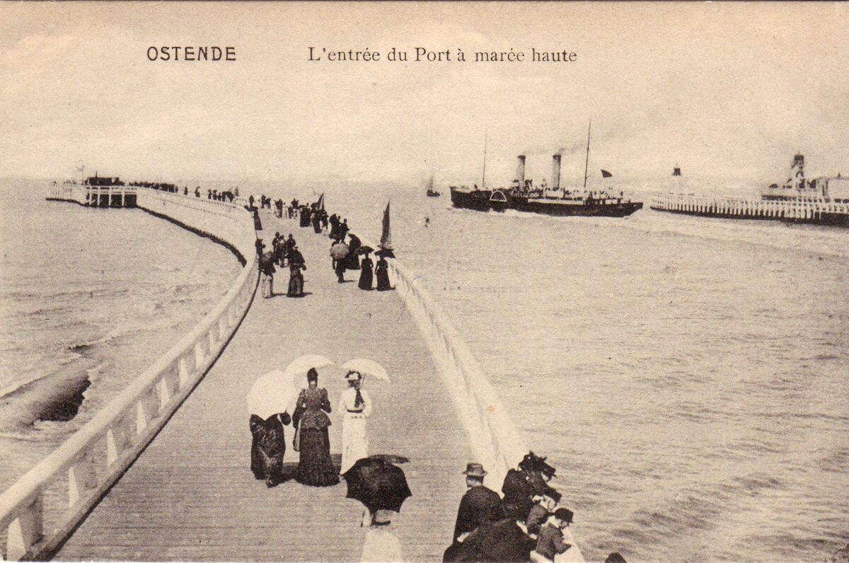 Ostende - L'Entrée du Port à marée haute. - Een pakketboot van de Oostende Doverlijn verlaat de haven van Oostende. - Wandelaars op het Weststaketsel. De vrouwen beschermen zich tegen de zon met hun parasols. Rechts, detail van het Ooststaketsel.
