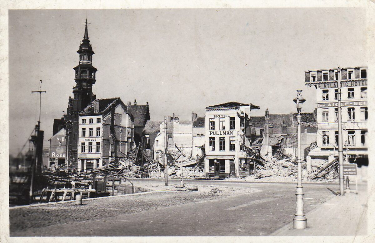 Oorlogsschade aan de gebouwen in de Vindictivelaan. Links het Zeevaartcommissariaat of Pilotage.