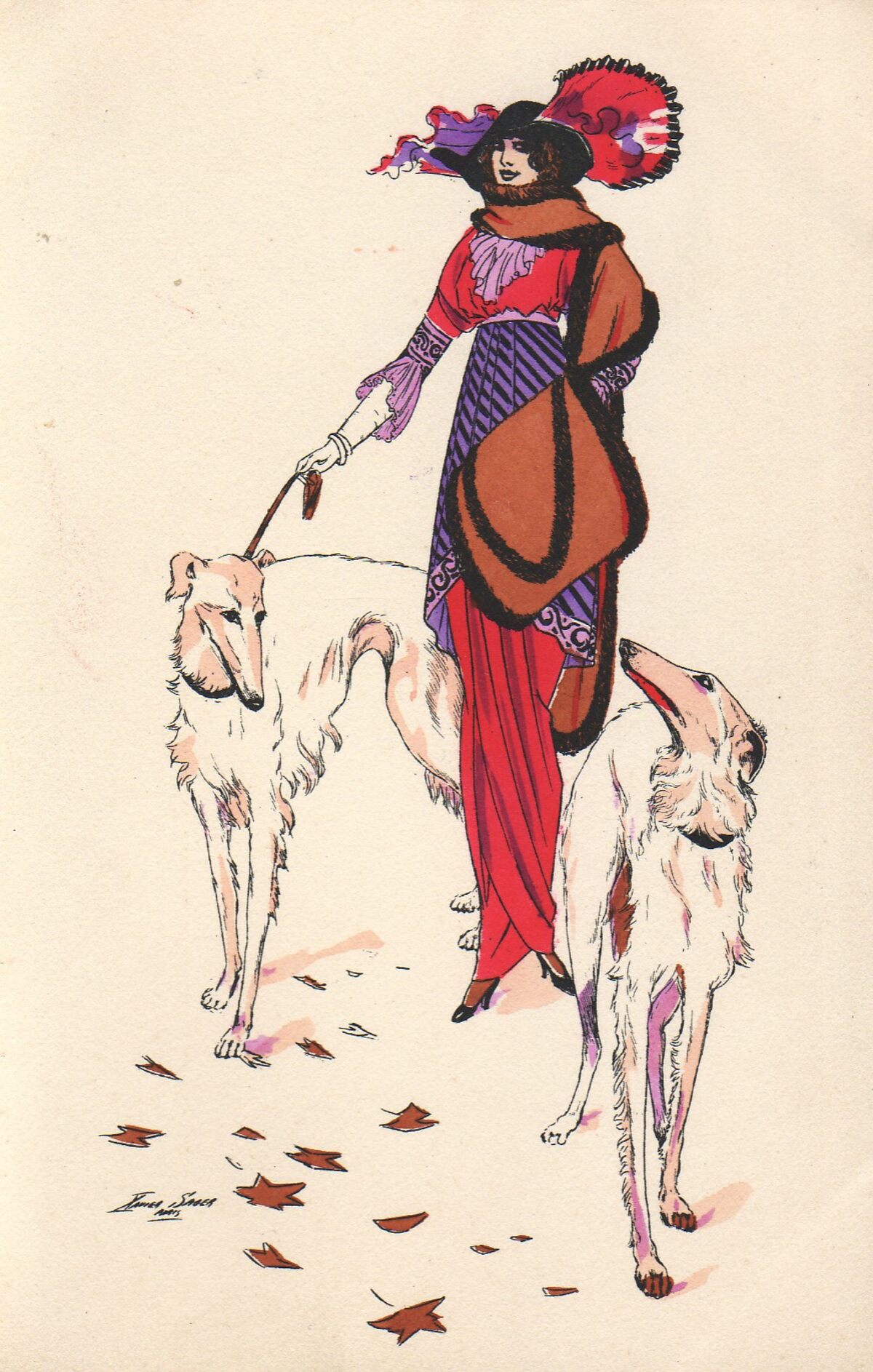 Postkaart : Fantasiekaart. Op wandel met mijn windhonden
