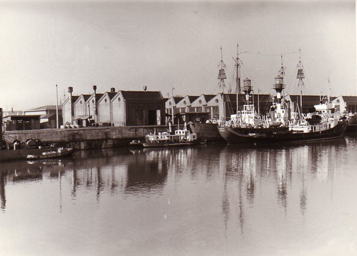 Formaat : 18 x 13 cm. Het Zeewezendok met lichtschepen. Het dok gezien vanaf de vismijnlaan. Op de achtergrond, de werkhuizen van het Bestuur van het Zeewezen