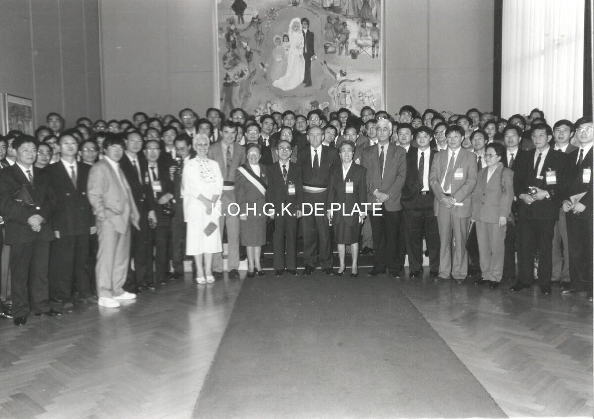 Formaat : 13 x 18 cm. - . Esperantogroep "La Konko" ontvangen op het stadhuis door burgemeester Goekint en enkele leden van het Schepencollege. De dame in wit naast schepen Paul Van Laere is Flory Witdoeckt.