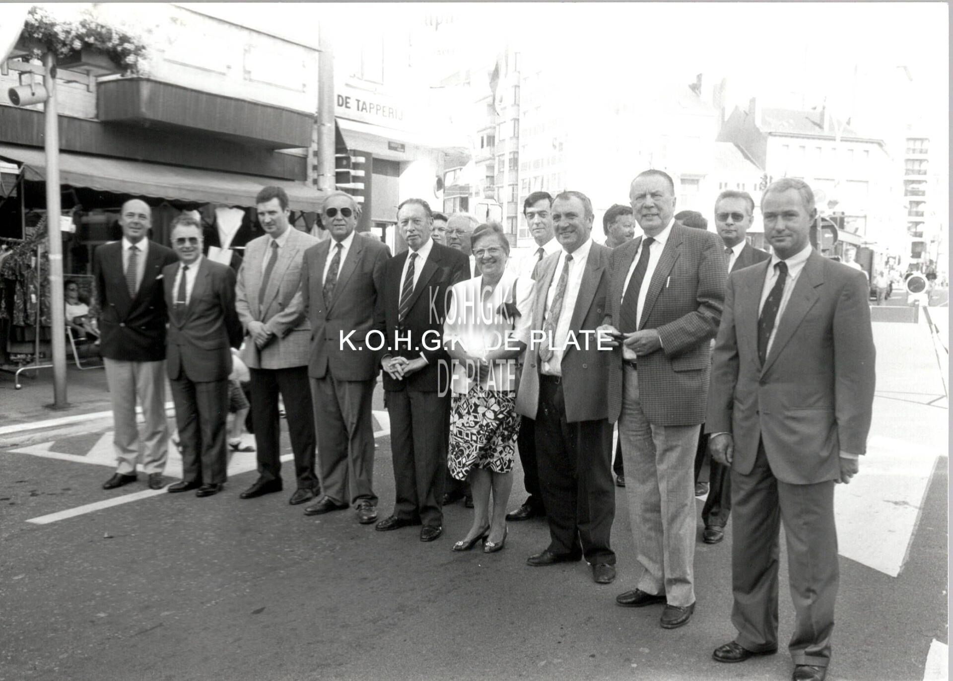 Formaat : 13 x 18 cm. - Opening van de braderie door leden van het schepencollege aan Petit Paris. Op de eerste rij v.l.n.r. : Schepenen Quaghebeur en Makelberghe, voorzitter van de handelaarsbond "'t Kroontje" Deschildere , burgemeester Goekint, schepenen Bourgois, Vercruysse, Vermeesch, Laridon en Quatacker