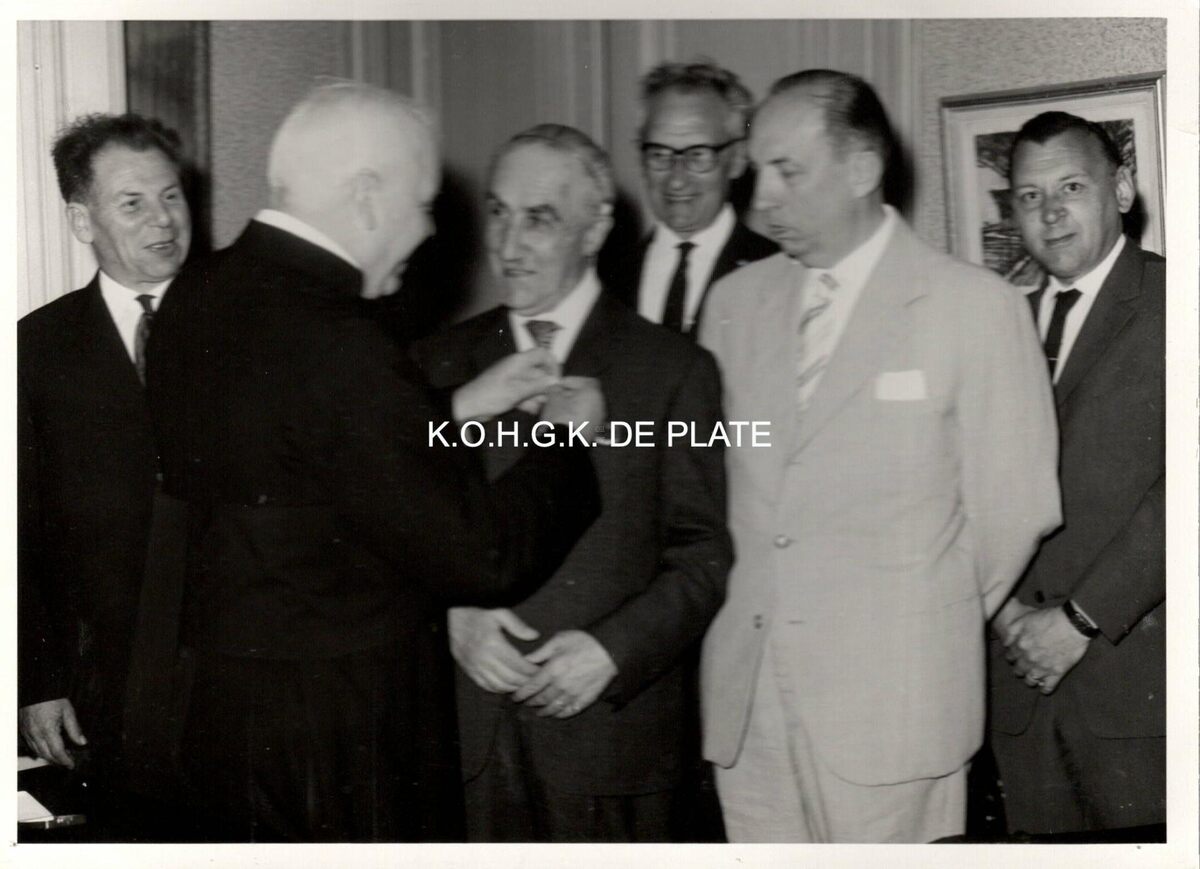 Formaat : 13 x 18 cm. - De heer Emile Van Caillie wordt het ereteken Pro Eccesia et Pontifice (Voor kerk en Paus) op de borst gespeld door Kanunnik-Deken Butaye in aanwezigheid van kerkheren Van Lerberghe, Deswaf en Dujardein, Bankdirecteur Piers